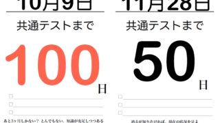 2026年1月17,18日の共通テストに向けて、 100日間カウントダウンカレンダーをご用意しました。 100日前である10月9日から、1日1ページになっています。 自分で自分を鼓舞し続けるのは大変。 カレンダーにある毎 … 続きを読む 共通テスト2026年(令和8年)1月17,18日に向けて 100日間カウントダウンカレンダー