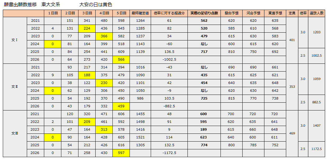 ちなみに私は、平井さんの予想に、勝手に今年度の文系平均点の増加分3%(+30点)を加えて、文Ⅰは行けそう、文Ⅲは危なそうと予想しました。