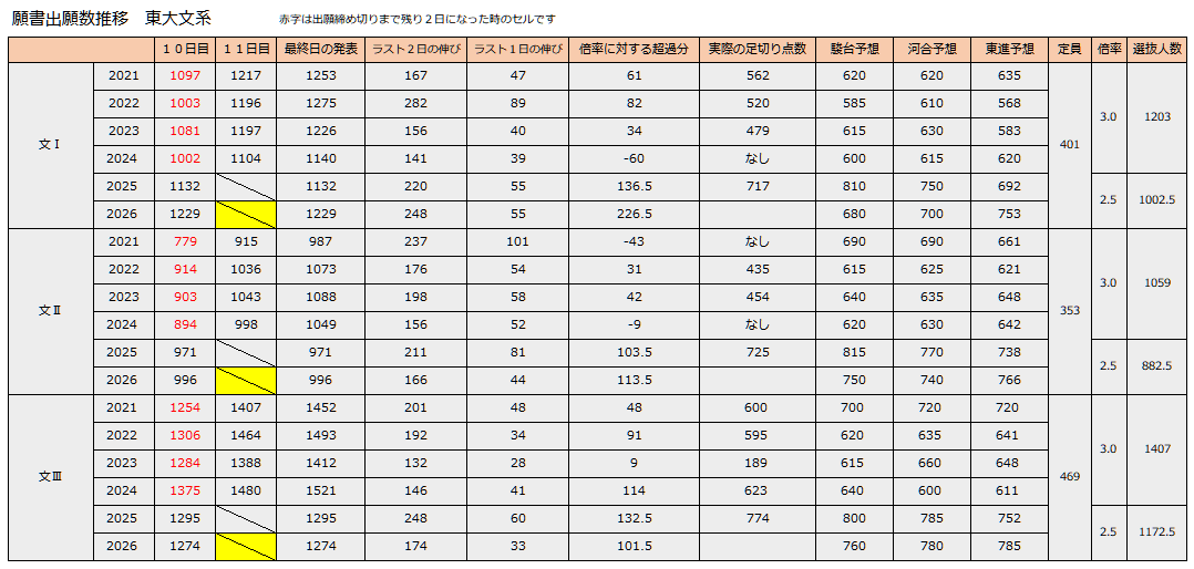 すると、例年最後の1日で大雑把に50通前後くらいふえているようです。すると、文Ⅱと文Ⅲは100人強が超過するくらいに落ち着くと思うので、文Ⅱも文Ⅲも大雑把に言って去年とほぼ同じ水準になるでしょう。
