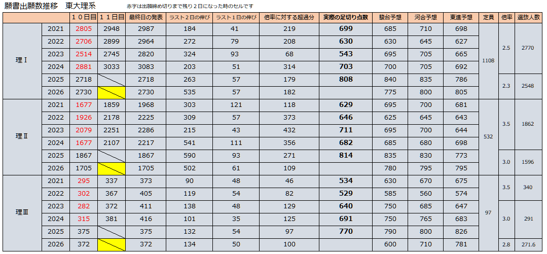これによって、現時点で理Ⅰは125名超過しています。そして、ラスト1日では50~100通伸びていることを考慮すると、超過は200名前後となるでしょうか。