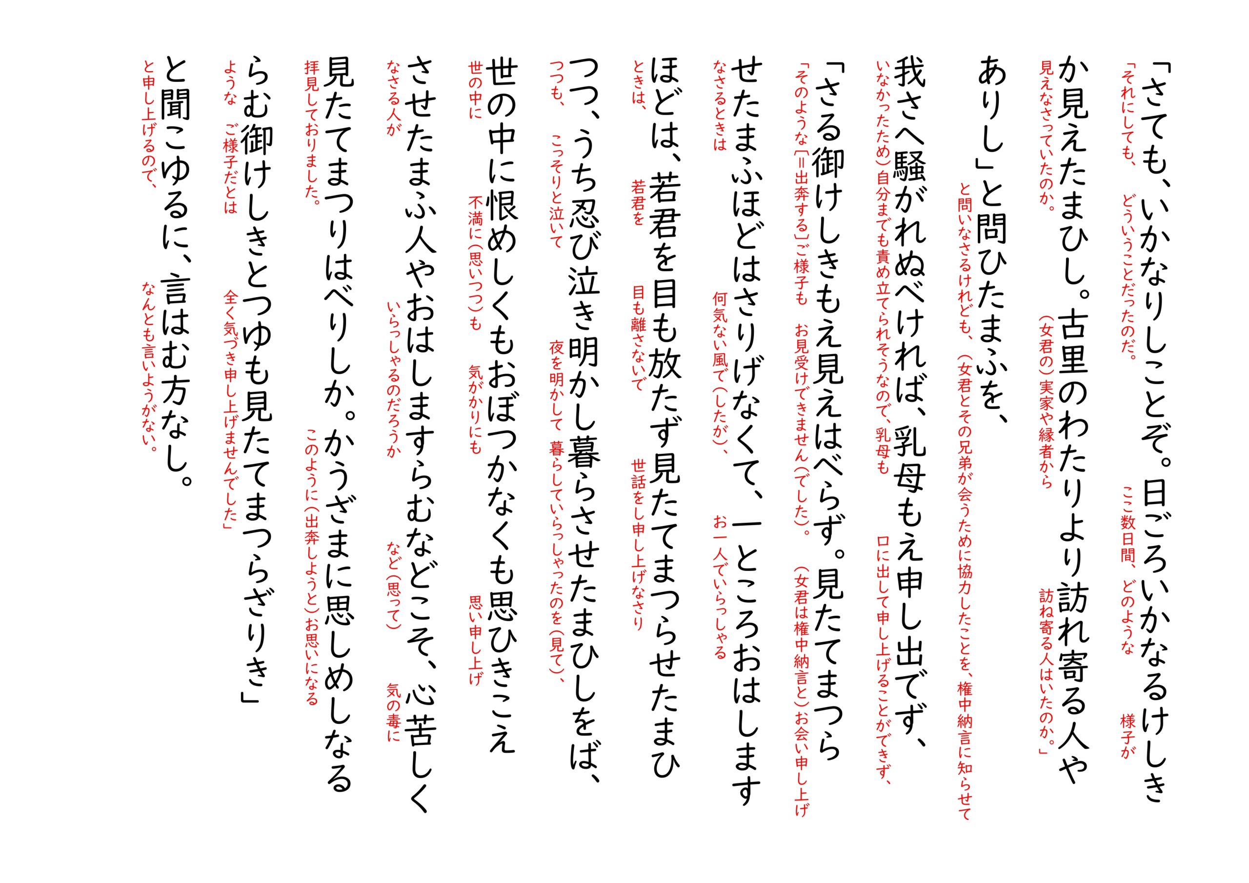 1⃣ 宇治においては、若君の乳母が、夜が明けるまで(女君が)部屋にお戻りにならないので不審だと思うが、格子などを上げ申し上げる時間になっても現れなさらない。人々が捜して不審に思い申し上げると、(乳母は)言い表しようが無いほど驚き呆れて、(他の人が)思いあたるはずのない所のすみずみなどまで捜し求め申し上げるけれども、どこにいらっしゃるだろうか、どこにもいらっしゃらない。どうしようもなく途方に暮れているうちに、権中納言がいらっしゃったので、(乳母が)「このように(女君が行方不明になりました)」と申し上げると、(権中納言は)少し聞きなさるとすぐに悲しみにくれて思い悩みなさり、正気も失いなさる。「それにしても、どういうことだったのだ。ここ数日間、どのような様子が見えなさっていたのか。(女君の)実家や縁者から訪ね寄る人はいたのか。」と問いなさるけれども、(女君とその兄弟が会うために協力したことを、権中納言に知らせていなかったため)自分までも責め立てられそうなので、乳母も口に出して申し上げることができず、「そのような〔=出奔する〕ご様子もお見受けできません(でした)。(女君は権中納言と)お会い申し上げなさるときは何気ない風で(したが)、お一人でいらっしゃるときは、若君を目も離さないで世話をし申し上げなさりつつも、こっそりと泣いて夜を明かして暮らしていらっしゃったのを(見て)、世の中に不満に(思いつつ)も気がかりにも思い申し上げなさる人がいらっしゃるのだろうかなど(思って)気の毒に拝見しておりました。このように(出奔しようと)お思いになるようなご様子だとは全く気づき申し上げませんでした」と申し上げるので、なんとも言いようがない。