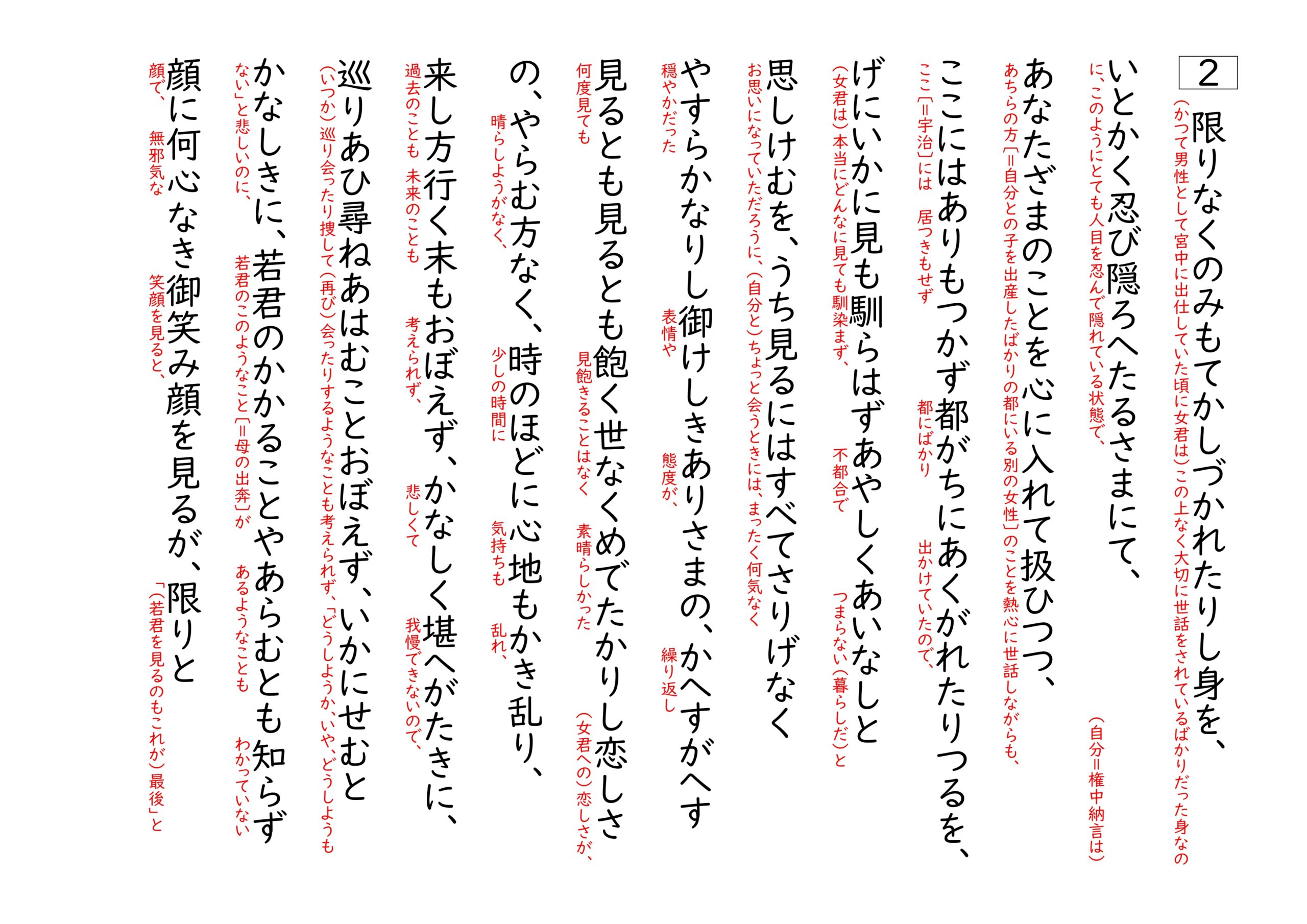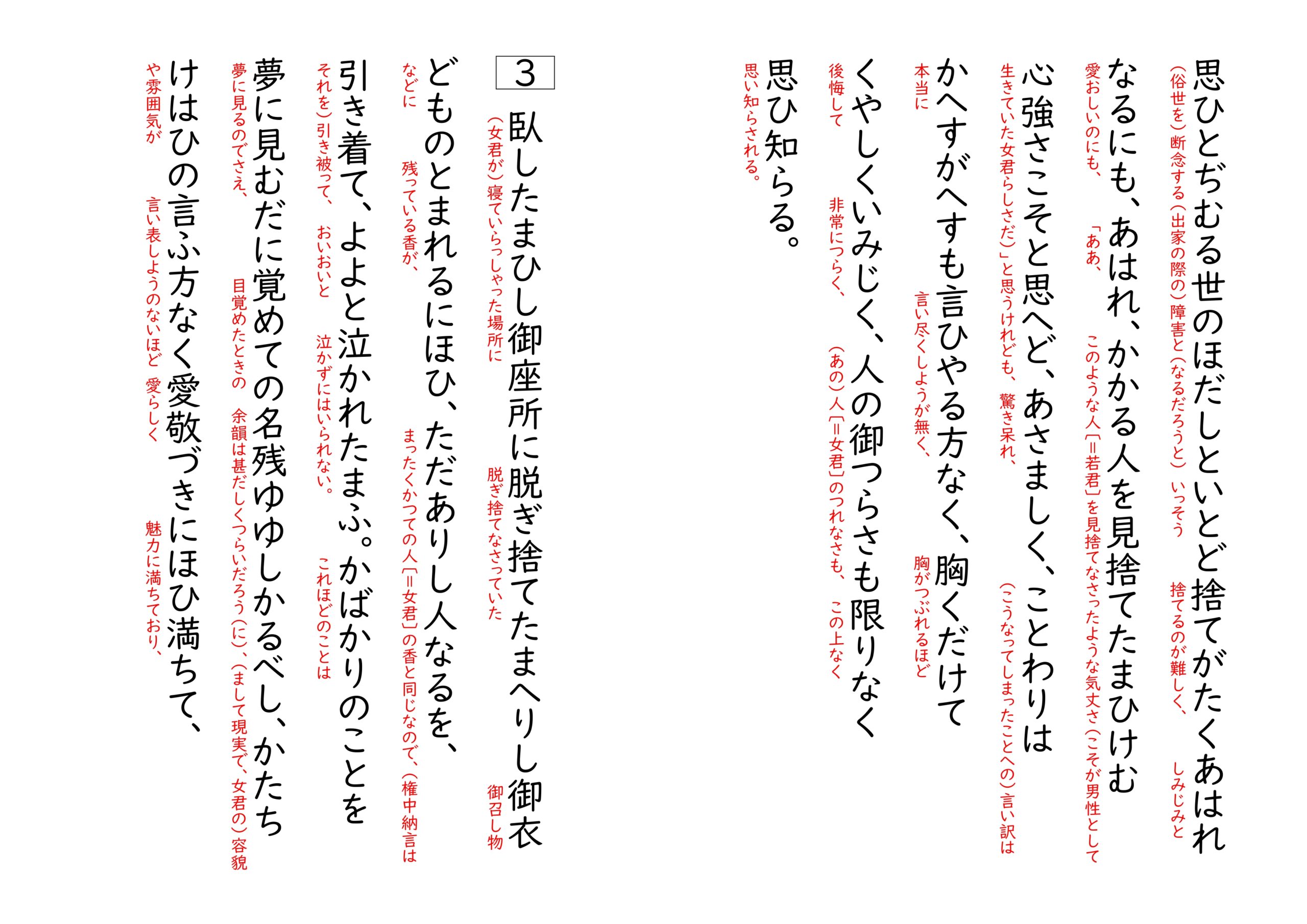 2⃣ (かつて男性として宮中に出仕していた頃に女君は)この上なく大切に世話をされているばかりだった身なのに、このようにとても人目を忍んで隠れている状態で、(自分=権中納言は)あちらの方〔=自分との子を出産したばかりの都にいる別の女性〕のことを熱心に世話しながらも、ここ〔=宇治〕には居つきもせず都にばかり出かけていたので、(女君は)本当にどんなに見ても馴染まず、不都合でつまらない(暮らしだ)とお思いになっていただろうに、(自分と)ちょっと会うときには、まったく何気なく穏やかだった表情や態度が、繰り返し何度見ても見飽きることはなく素晴らしかった(女君への)恋しさが、晴らしようがなく、少しの時間に気持ちも乱れ、過去のことも未来のことも考えられず、悲しくて我慢できないので、(いつか)巡り会ったり捜して(再び)会ったりするようなことも考えられず、「どうしようか、いや、どうしようもない」と悲しいのに、若君のこのようなこと〔=母の出奔〕があるようなこともわかっていない顔で、無邪気な笑顔を見ると、「(若君を見るのもこれが)最後」と(俗世を)断念する(出家の際の)障害と(なるだろうと)、いっそう捨てるのが難しく、しみじみと愛おしいのにも、「ああ、このような人〔=若君〕を見捨てなさったような気丈さ(こそが男性として生きていた女君らしさだ)」と思うけれども、驚き呆れ、(こうなってしまったことへの)言い訳は本当に言い尽くしようが無く、胸がつぶれるほど後悔して非常につらく、(あの)人〔=女君〕のつれなさも、この上なく思い知らされる。
