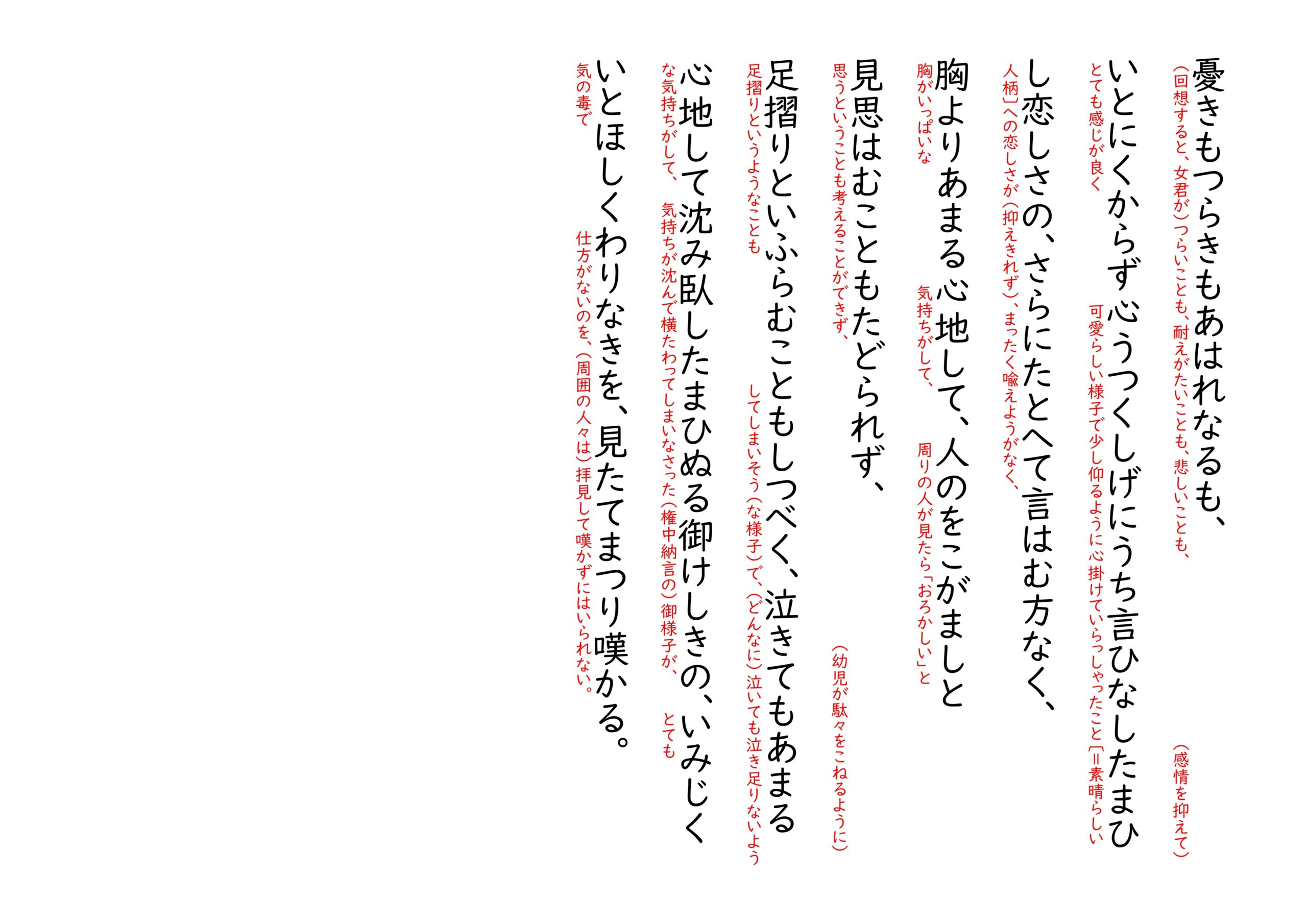 3⃣ (女君が)寝ていらっしゃった場所に脱ぎ捨てなさっていた御召し物などに残っている香が、まったくかつての人〔=女君〕の香と同じなので、(権中納言はそれを)引き被って、おいおいと泣かずにはいられない。これほどのことは夢に見るのでさえ、目覚めたときの余韻は甚だしくつらいだろう(に)、(まして現実で、女君の)容貌や雰囲気が言い表しようのないほど愛らしく魅力に満ちており、(回想すると、女君が)つらいことも、耐えがたいことも、悲しいことも、(感情を抑えて)敢えてとても感じが良く可愛らしい様子で少し仰るようにして(穏やかな態度で)いらっしゃったこと〔=素晴らしい人柄〕への恋しさが(抑えきれず)、まったく喩えようがなく、胸がいっぱいな気持ちがして、周りの人が見たら「おろかしい」と思うということも考えることができず、(幼児が駄々をこねるように)足摺りというようなこともしてしまいそう(な様子)で、(どんなに)泣いても泣き足りないような気持ちがして、気持ちが沈んで横たわってしまいなさった(権中納言の)御様子が、とても気の毒で仕方がないのを、(周囲の人々は)拝見して嘆かずにはいられない。