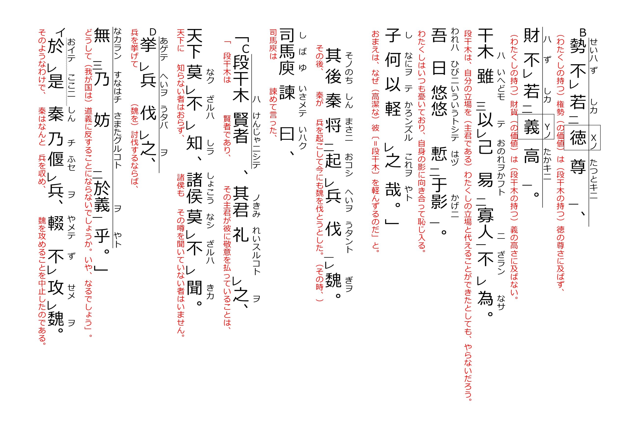 その後、秦が兵を起こして魏を伐とうとした。(その時、)司馬庾は諫めて言った、「段干木は賢者であり、その主君が彼に敬意を払っていることは、天下に知らない者はおらず、諸侯もその噂を聞いていない者はいません。