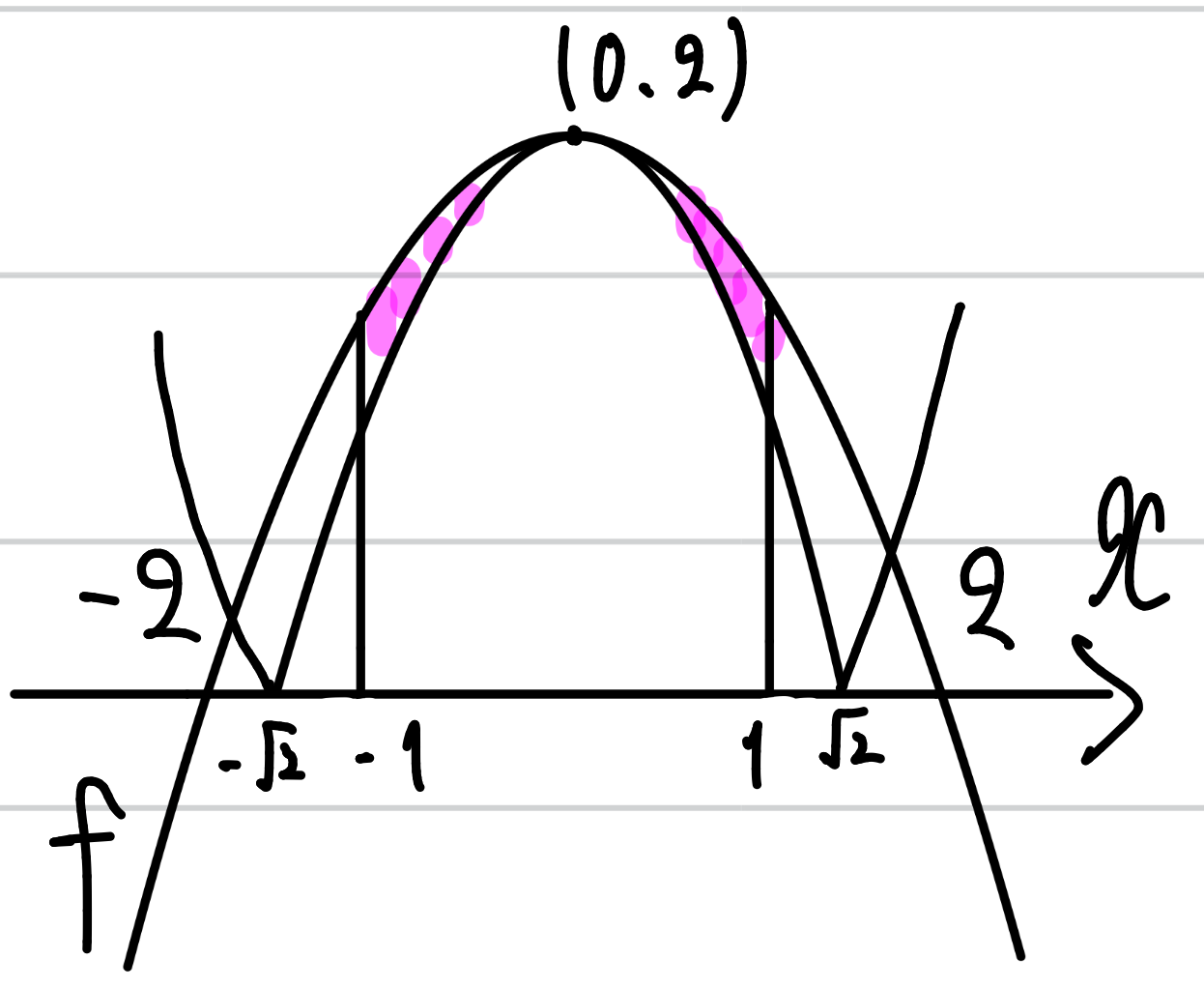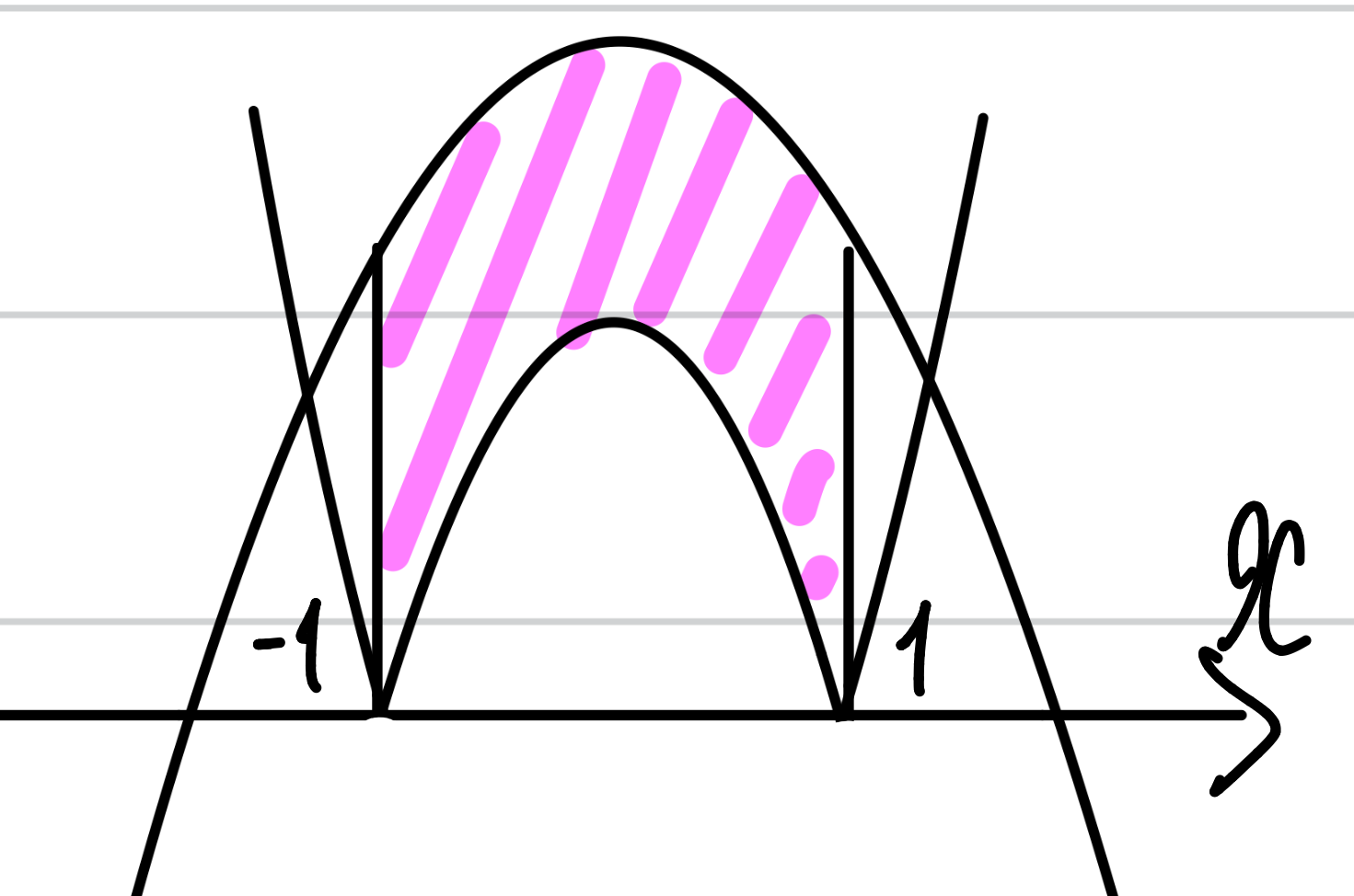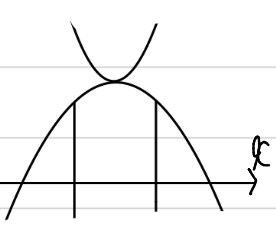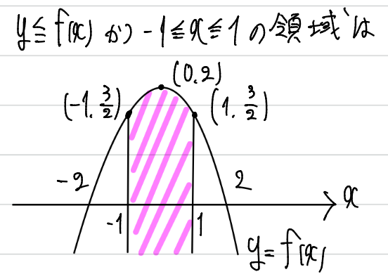 すると、ー1から1の範囲で、上に凸のグラフが描けますね。領域としては、y≦f(x)なので、下側になります。このグラフに、真ん中のgを合わせていくように考えます。