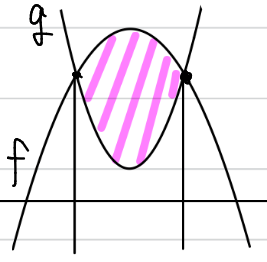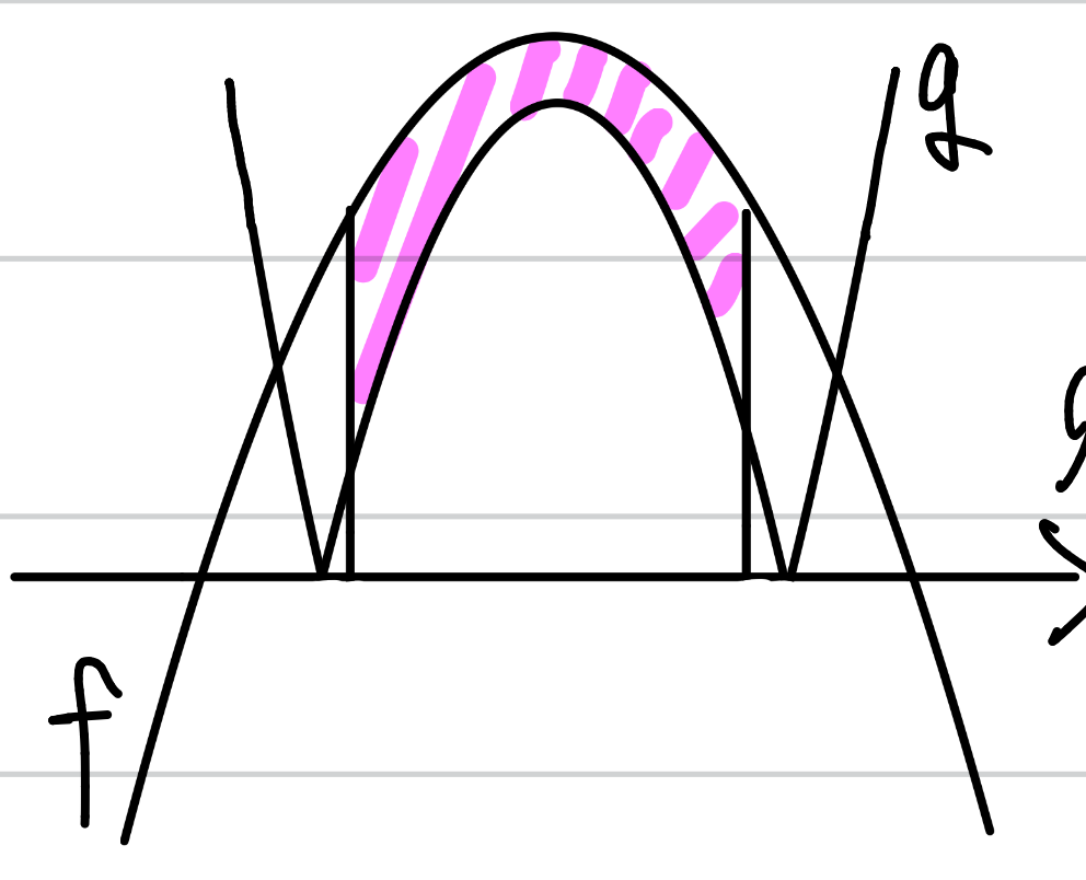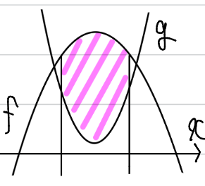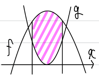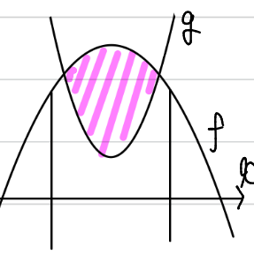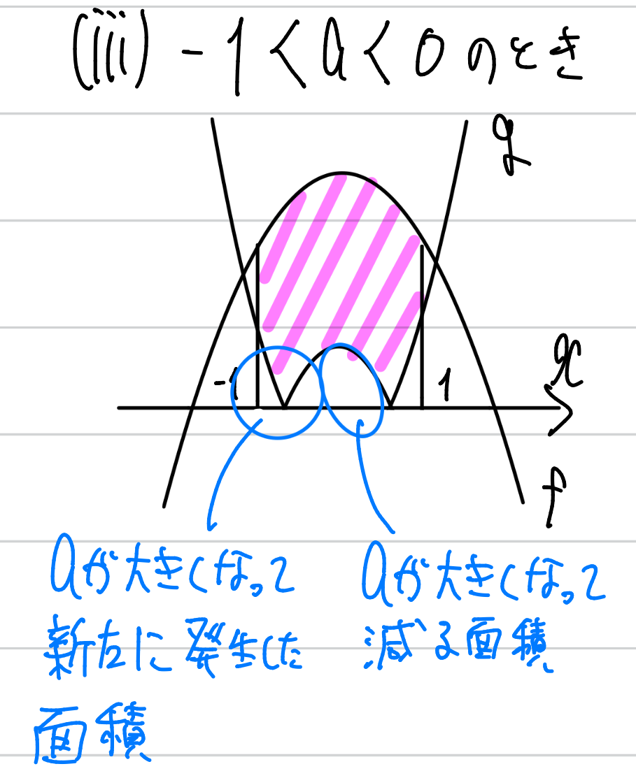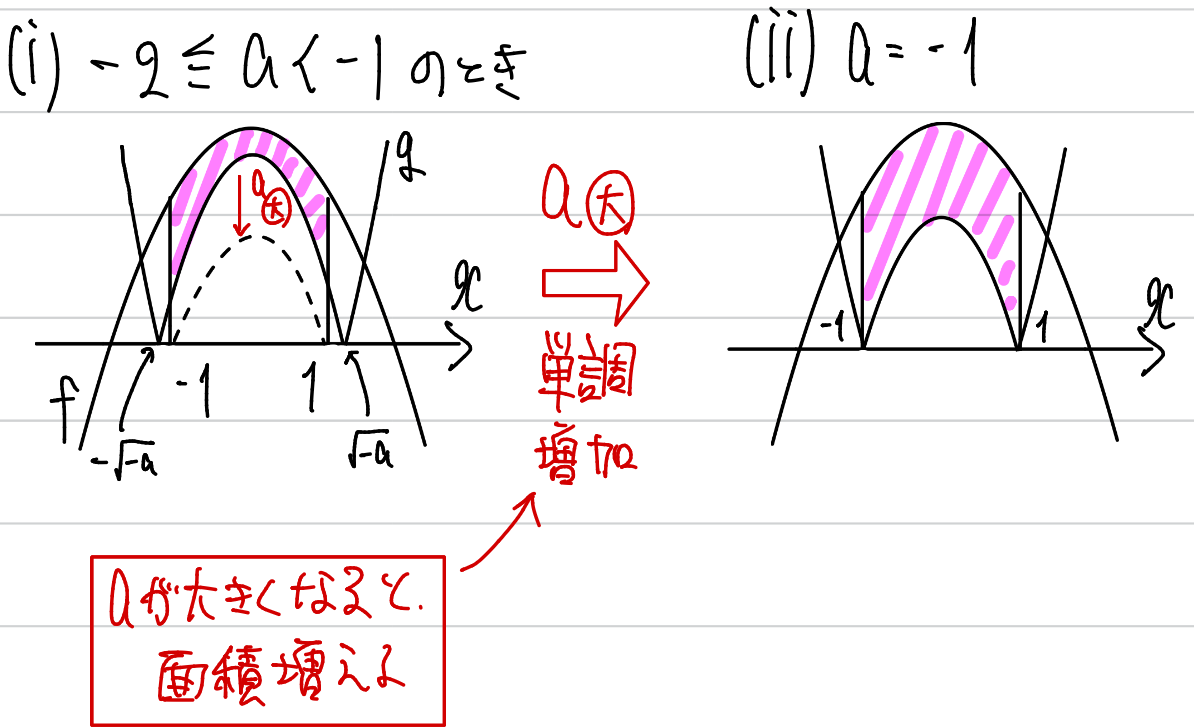 aが大きくなるほど、gの放物線(を上下反転させた上に凸の部分)が下に下がります。すると、明らかに面積が増えます。ということは、ー2<a<ー1において面積は単調増加になり、a=ー1の場合の面積より必ず小さいことが分かりますので、ー2<a<ー1の場合は面積を計算する必要がありません。