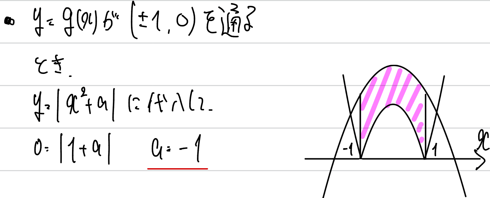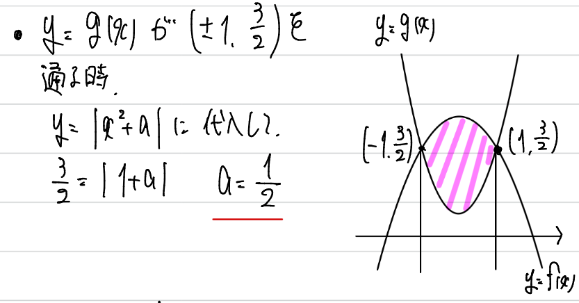 そこで、gとx軸の交点がx=±1を通る場合のaを調べると、a=ー1であることが分かります。