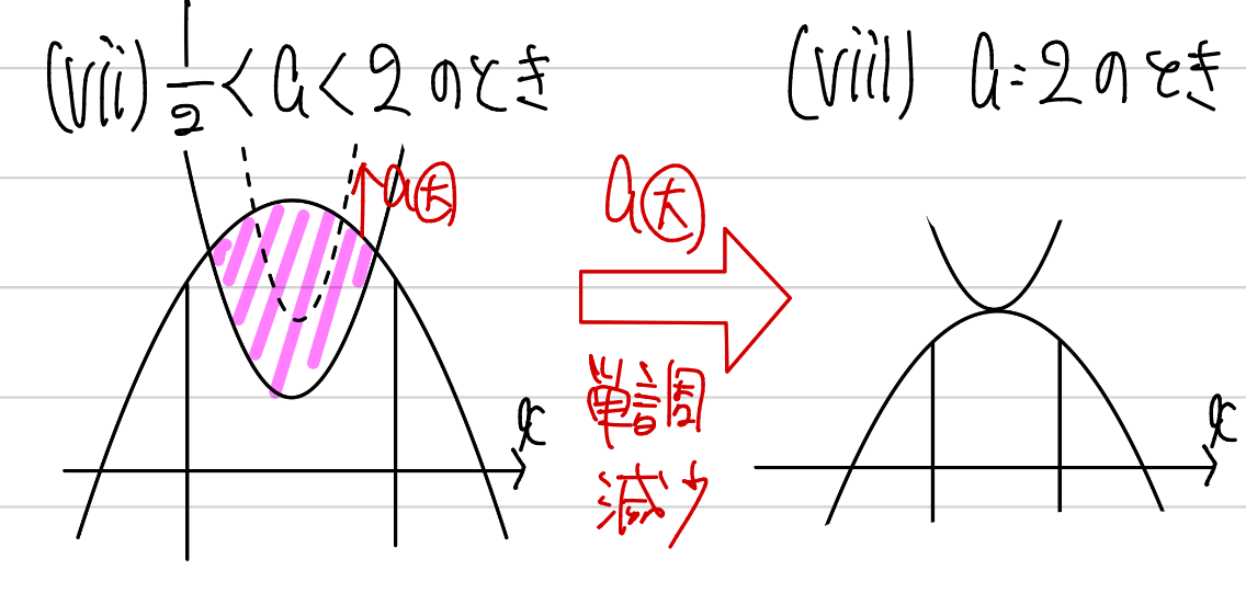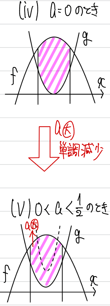 このときは、aが大きくなるにつれて、gの放物線(反転していない)が上に移動していきます。すると、面積はあきらかに減っていくことが分かりますね。つまり0<a<1/2において面積は単調減少であることがわかるので、やはり面積を計算する必要がありません。