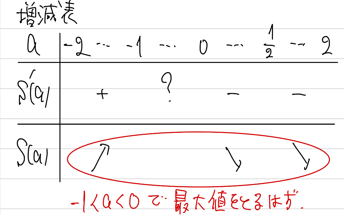 これを見ると、結局ー1<a<0の場合に最大値を取るはずだと分かりますね。