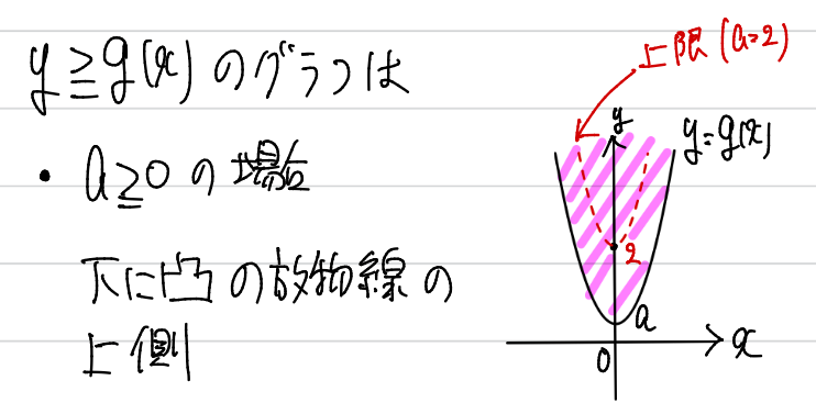 ということで、放物線を素直に書いて終わりですね。ということで、y≧g(x)のグラフはこんな感じです。