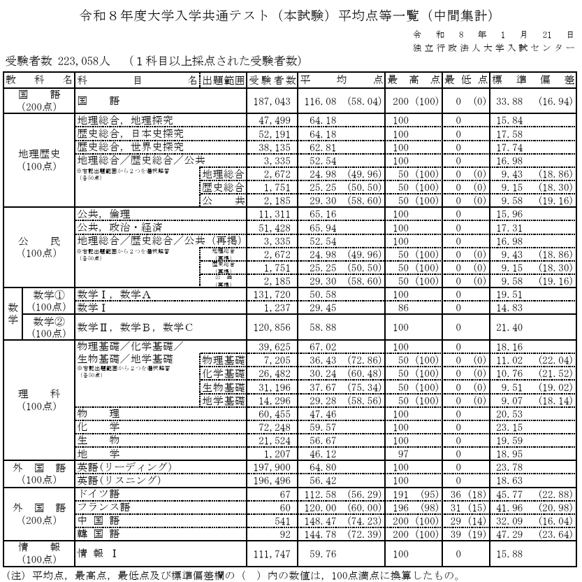 共通テスト平均点(中間集計)