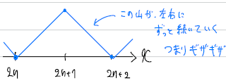 これらを組み合わせると、「偶数から奇数のxでは、傾き1の直線」で「奇数から偶数のxでは、傾きー1の直線」という意味に解釈できますね。