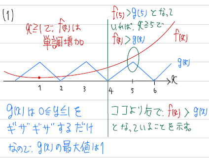 (1)は「x≧4においてf(x)>gx)であることを示せ」というものです。最初の「x≧4において」も「すべてのx≧4において」という意味です。つまり、x軸の4より右側では必ずf(x)が上にあって、g(x)が下にあることを示す問題です。