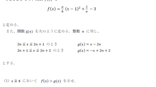 目次2026年 東京大学数学 文系第3問下に凸の放物線と、ギザギザ(1)x≧5は調べなくてもよいfーgの最小値を調べるように論理を展開軸の位置、相加相乗、等号成立しない証明・・と手数が多い(2)またまた、初めにグラフを確 … 続きを読む 2026年東大文系数学(第3問)入試問題の解答(答案例)・解説