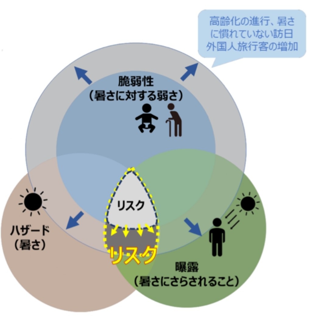 曝露とは暑さにさらされることを意味し、脆弱性は暑さに対する弱さを表します。