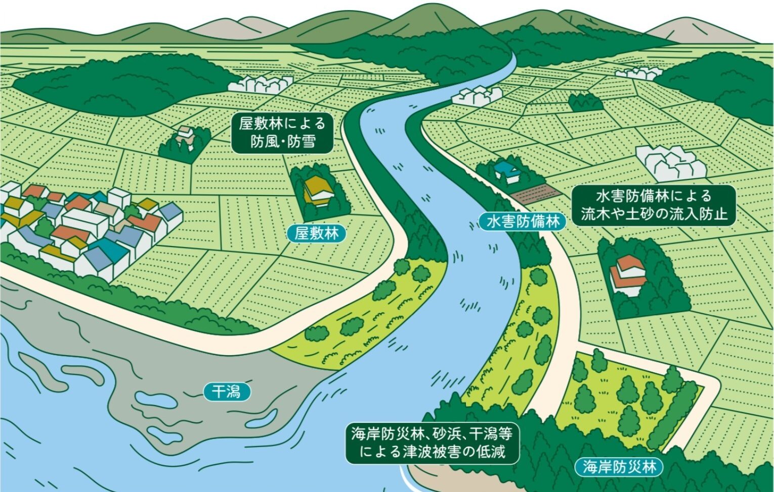 森林ばかりではなく、川岸の植生が河岸侵食を防いだり、本年度の1Aでもご紹介したサンゴ礁が高潮被害を軽減したり、湿原や田んぼが洪水被害の軽減に役立ったりと、自然環境には防災や減災に活かせるチカラがたくさんあるのです。