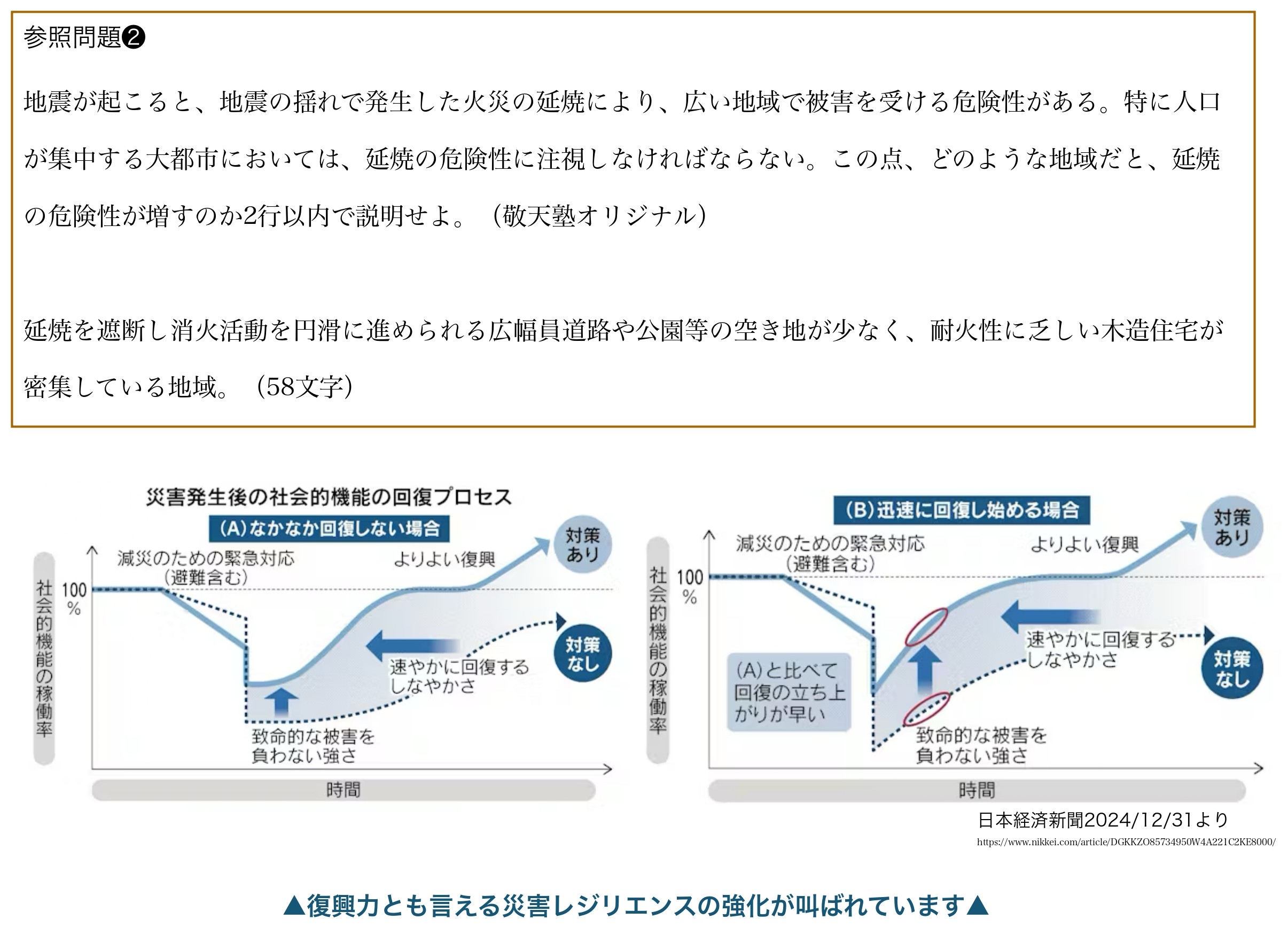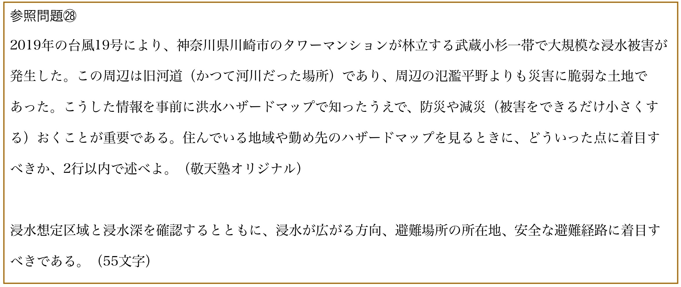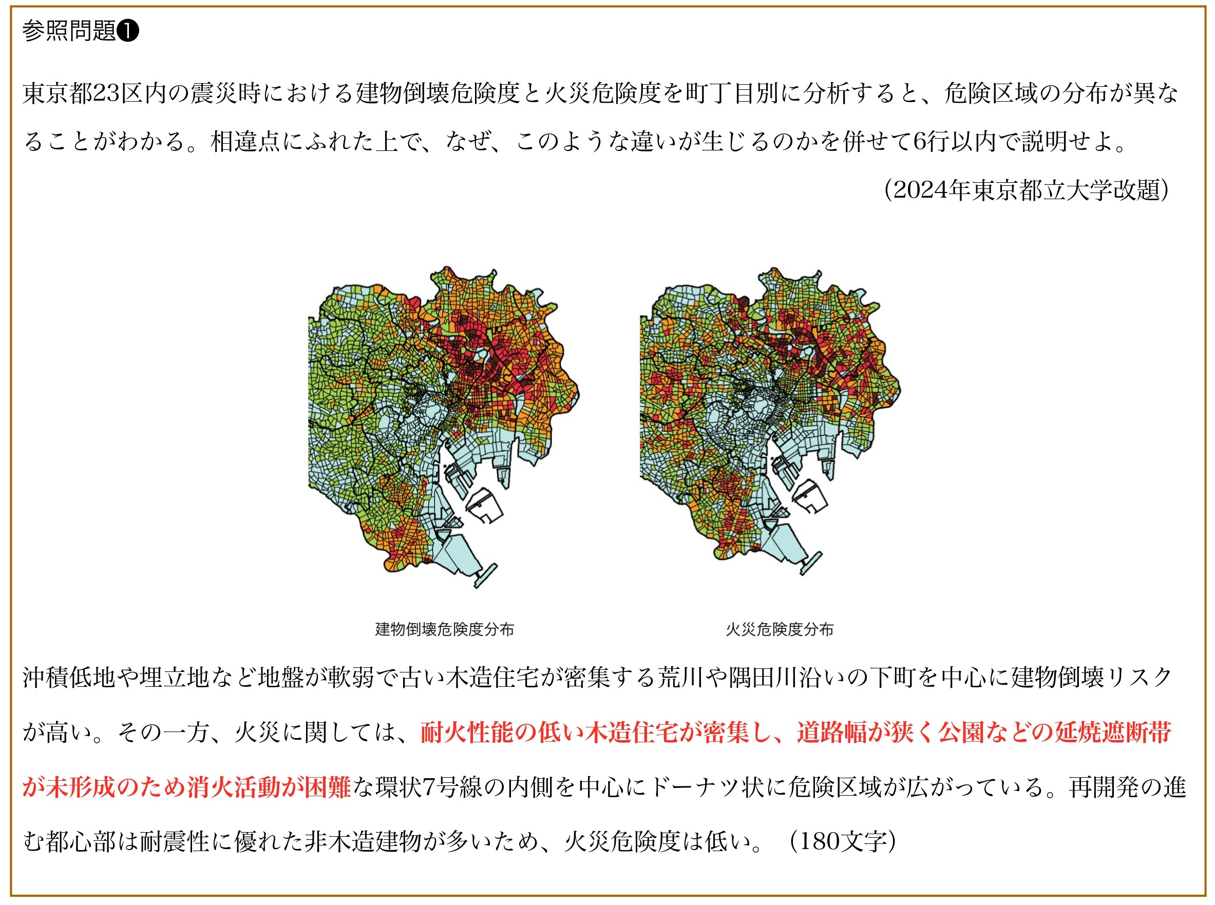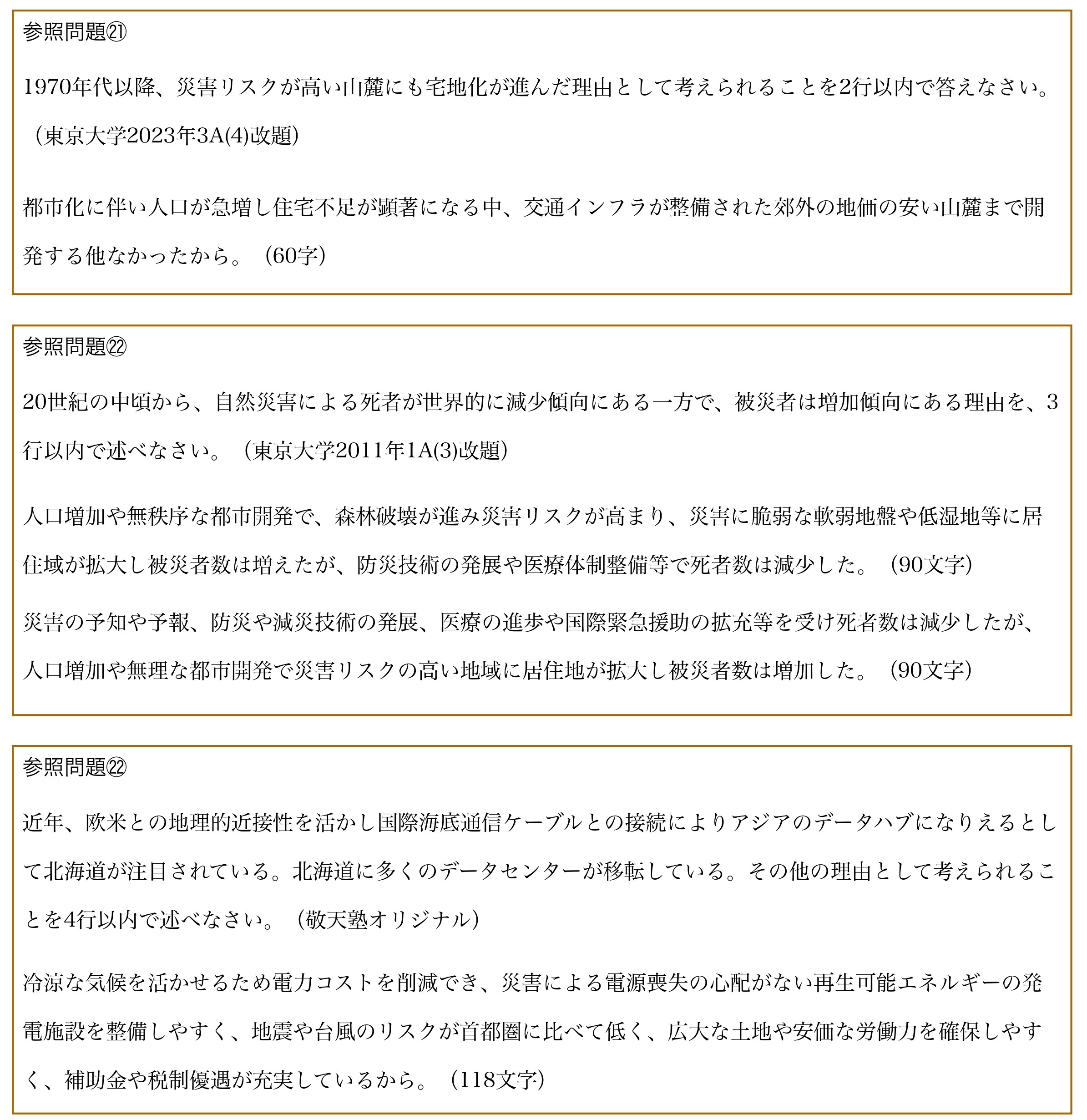東大地理では、災害に関連した問題を好んで出してきますので、地震や津波といった災害に対して、どのような解決策が考えられるのか、今回学んだ「ハザード」「脆弱性」「曝露」の3つの観点から考察を深める習慣を身につけましょう。