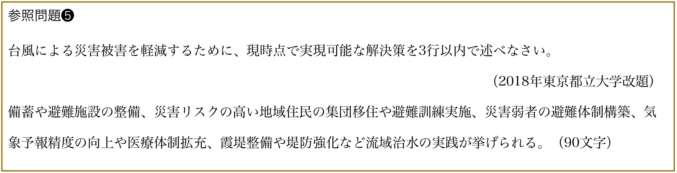 たとえば、台風による災害被害を減らすためにどうしたら良いかという問題が2018年の東京都立大学で問われましたが、皆さんならどう答えますか。