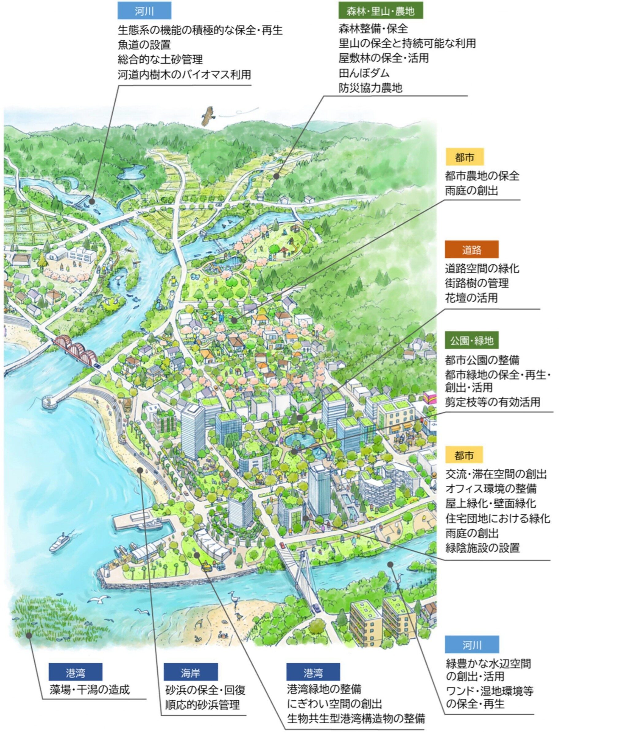 国土交通省『グリーンインフラ推進戦略2030』では自然環境の利活用法が多く紹介されています。