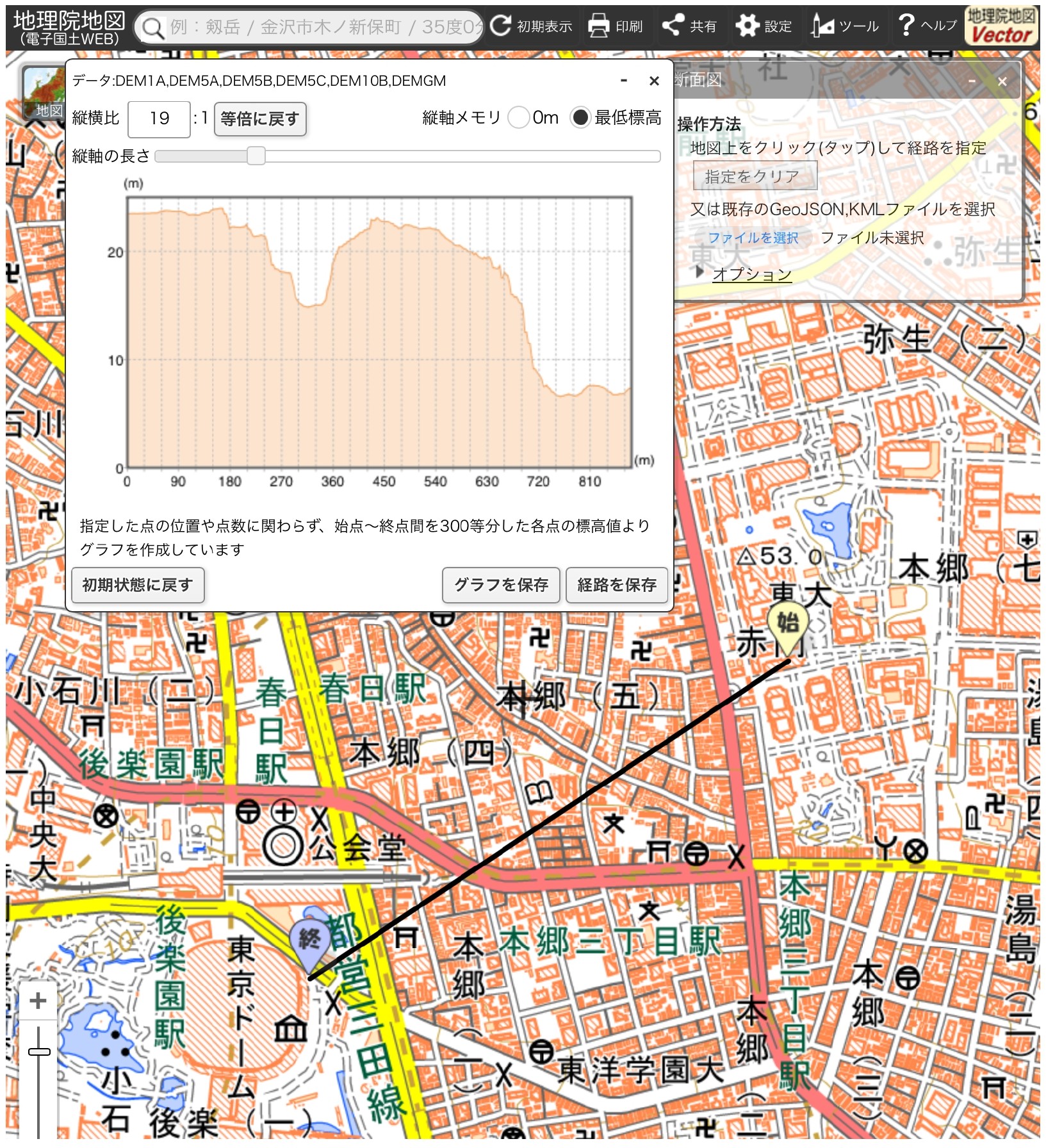 さらに、国土地理院の地図が最強なところは、断面図を表示できるところにもあります。