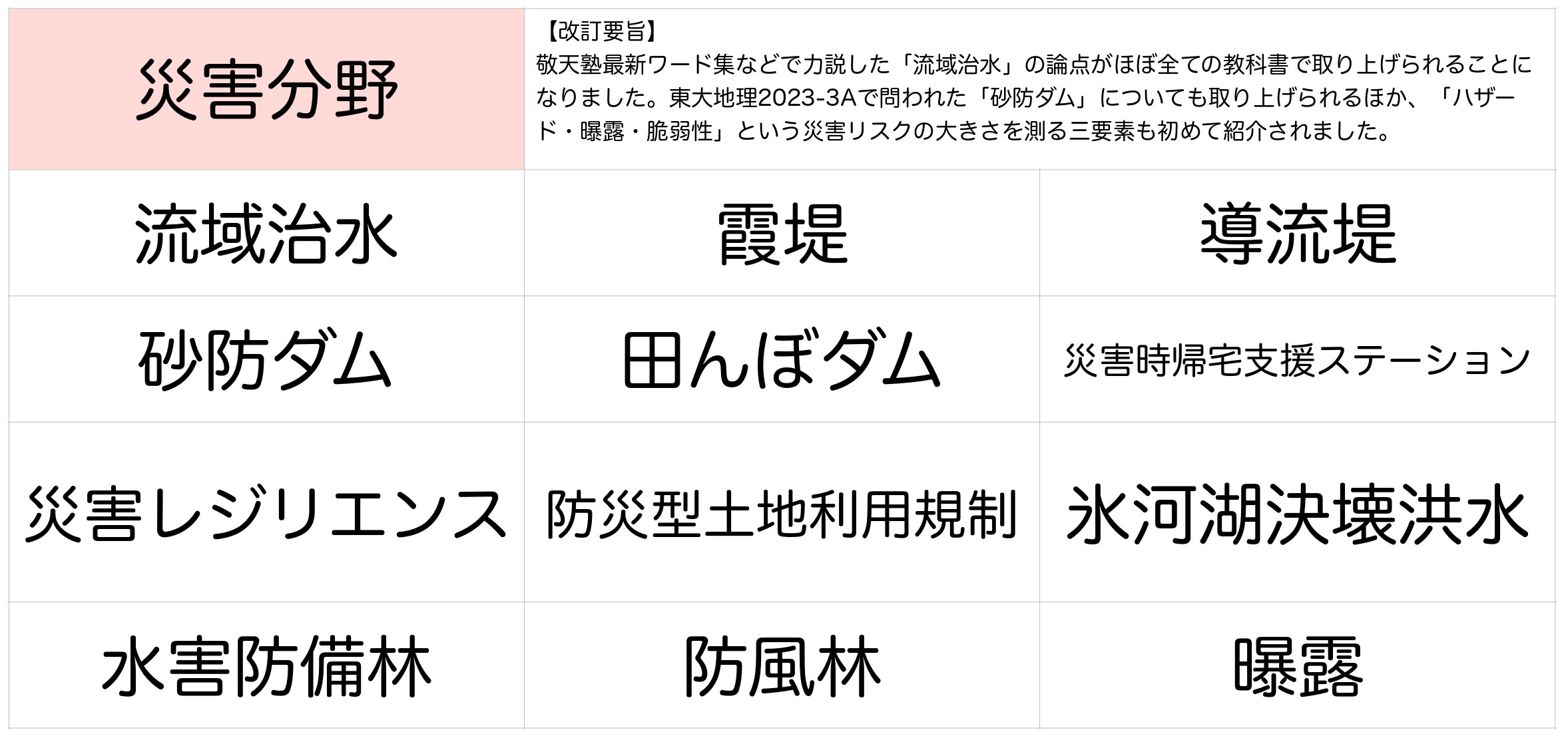 本年度の3Cで問われた流域治水に関しましても、2026年4月に全国の高校で配布される地理総合の教科書で大々的に掲載される内容でした。