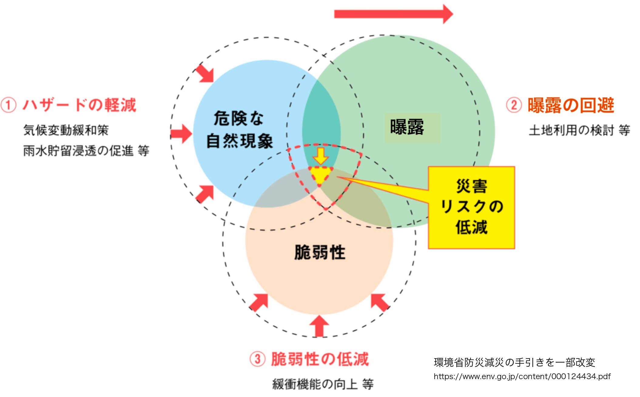 リスクを回避すべくインフラ整備などで脆弱性の低減を図るには大規模な工事を伴いますから、危険地域から引っ越しをするなど危険から逃れる策(=曝露の回避)も併せて考えることが実効性に富みます。