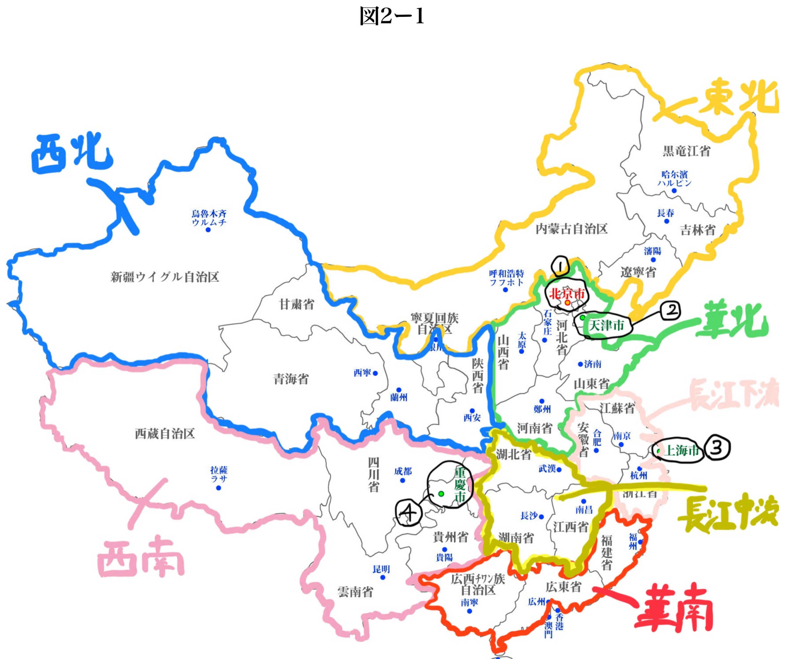 ②ー天津(テンチン)、④ー重慶(チョンチン)