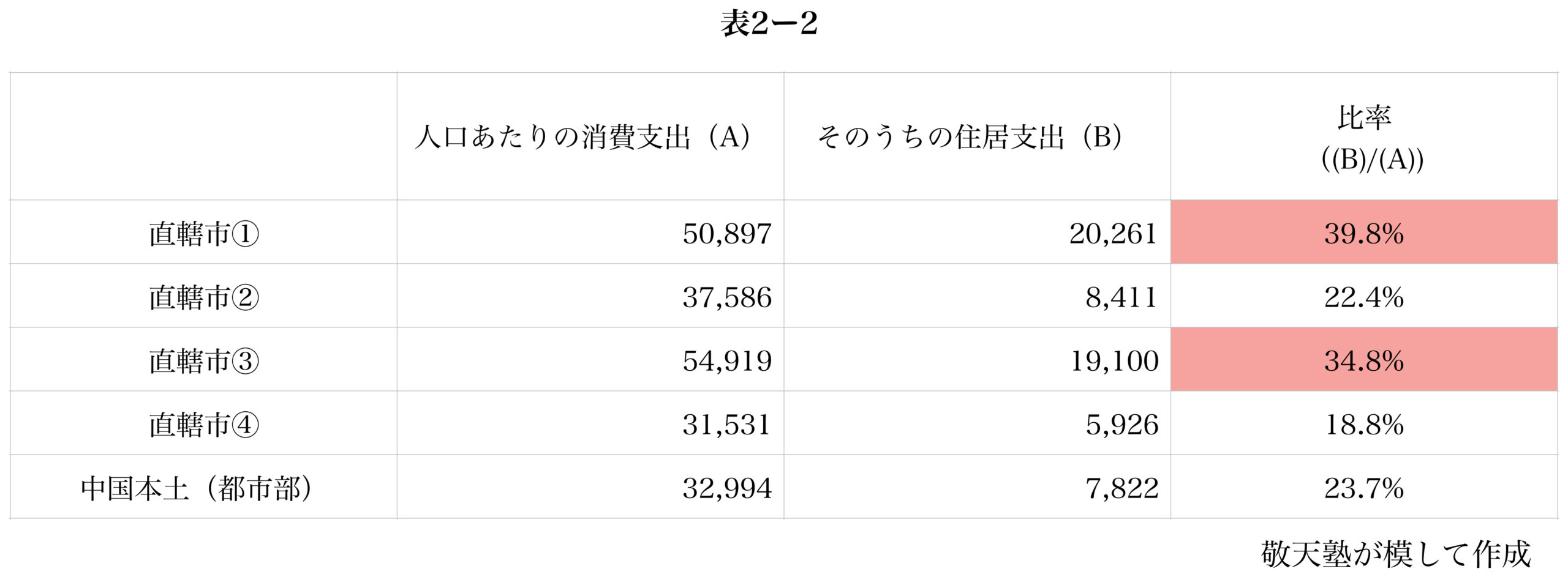 表2ー2は2023年の人口あたりの消費支出とそのうちの住居支出を示したものである。この表より直轄市①や③でどのような都市問題が生じていることが読み取れるか。原因とあわせて2行以内で述べよ。