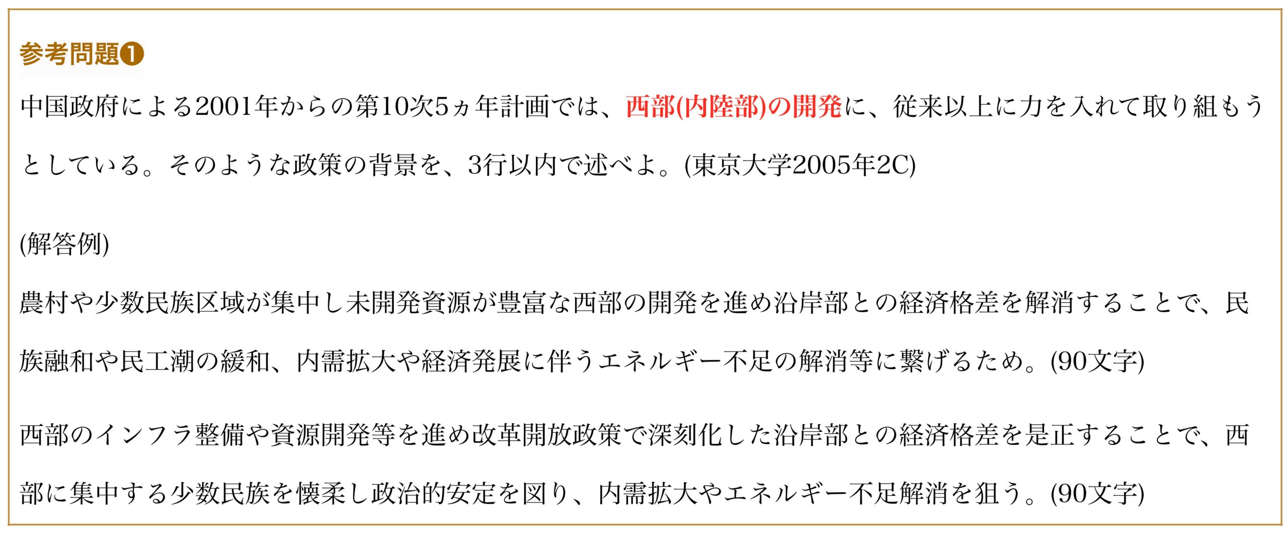 入試当日の所感記事でも申し上げましたが、④(=重慶)が沿岸部から離れた内陸部であること、中国が行なっている「施策」のうち受験生が知っているものは、せいぜい一人っ子政策・改革開放政策・西部大開発くらいであることにみれば、答えは自ずと「西部大開発」と定まります。