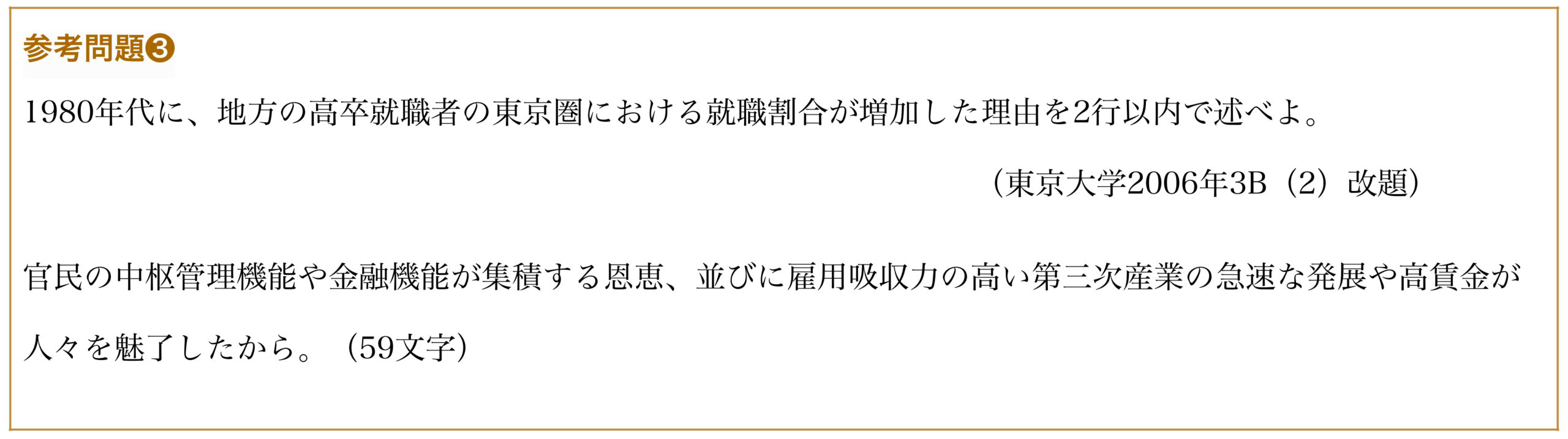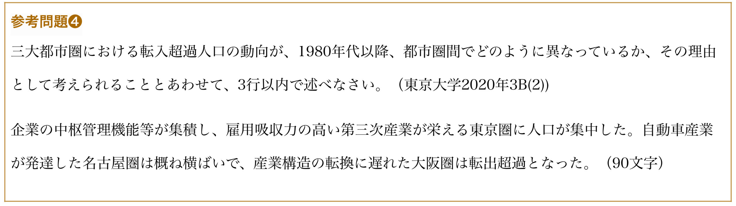 なお、図表から読み取れることですから家賃高騰を書けば十分だと思いますが、そこからさらに人がたくさん流入したんだから都市化特有の問題も起きたはずだと考え、+αの知識を書いても良いとは思います。