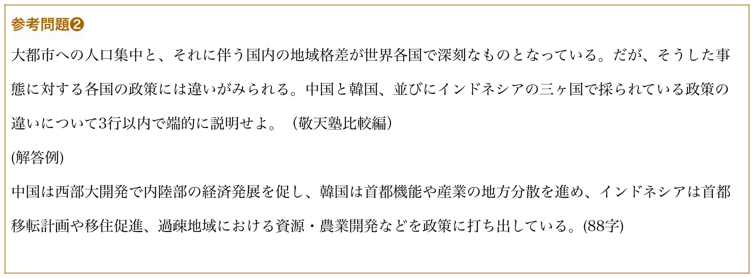 なお、中国、韓国、インドネシアにおける地域格差については地理探究の教科書でしっかりと書かれていますが、各国で採られている是正策についてまでは、意外と整理されていない受験⽣が多いのではないでしょうか。