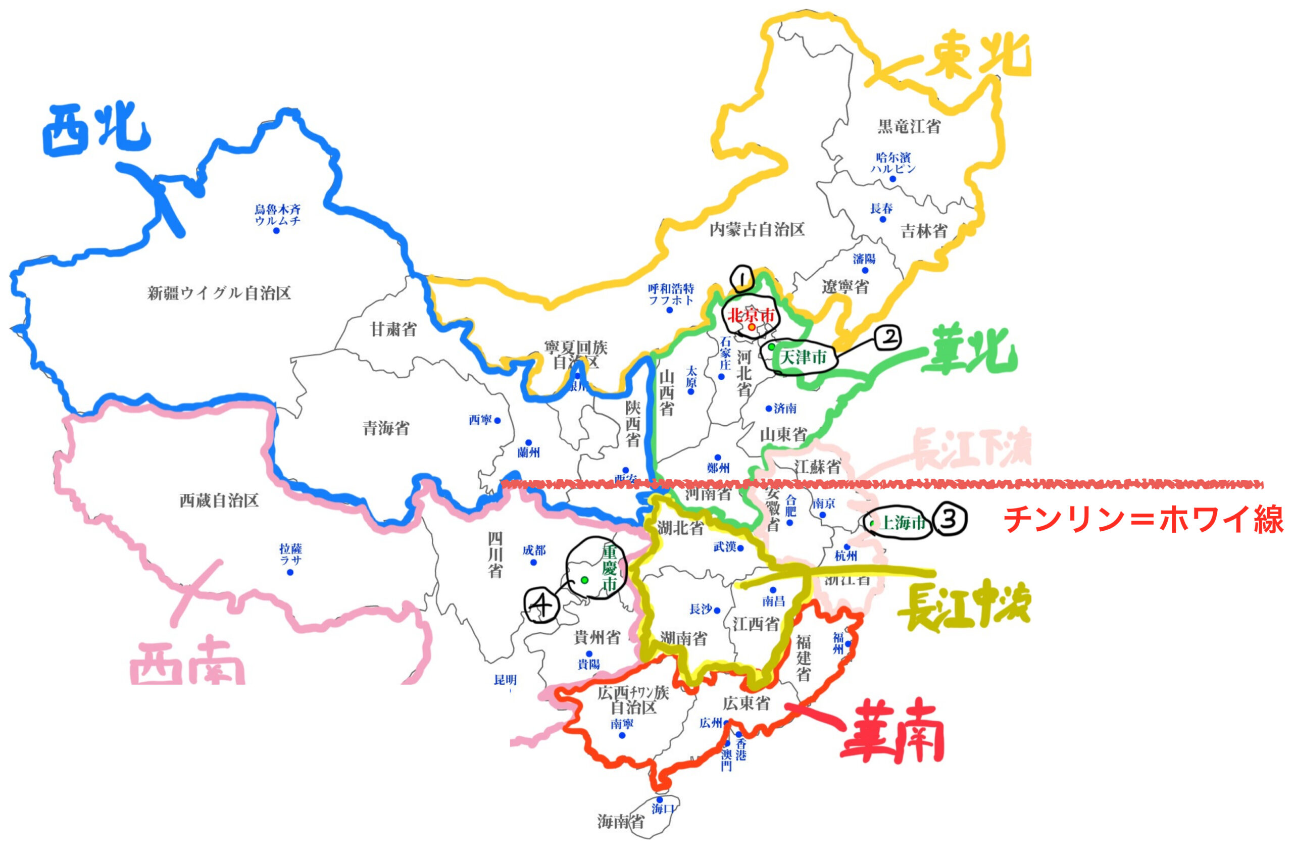 上海あたりを通るこの線を境に南米北麦(チンリン=ホワイ線より南では降水量も多いためお米を作れるが、この線より北側では雨が少ないから小麦を作るほかないという意味です。中国北部の主食は昔から水餃子でした。小麦で作れるからです。その一方、チャーハン系は中国南部が起源だそうですよ。このように料理で地域の産業を考えてみるのも面白いですね。)