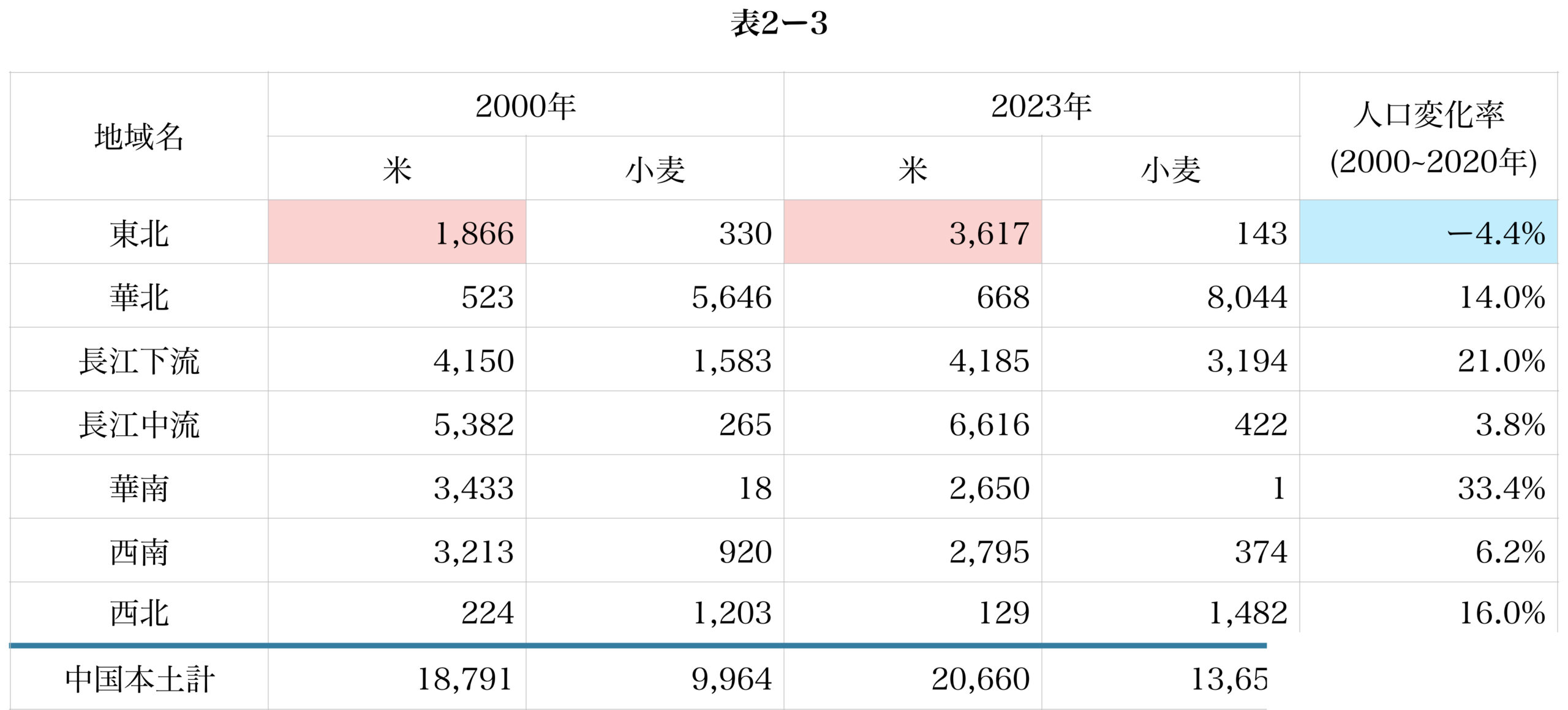 表2ー3は地域別に米および小麦の生産量(2020年と2023年)と人口変化率(2000〜2023年)を示したものである。2000年以降に東北地域において米の生産量が増加した理由を、中国本土全体の動向を踏まえて、国土利用の観点と技術的観点のそれぞれからあわせて3行以内で述べよ。