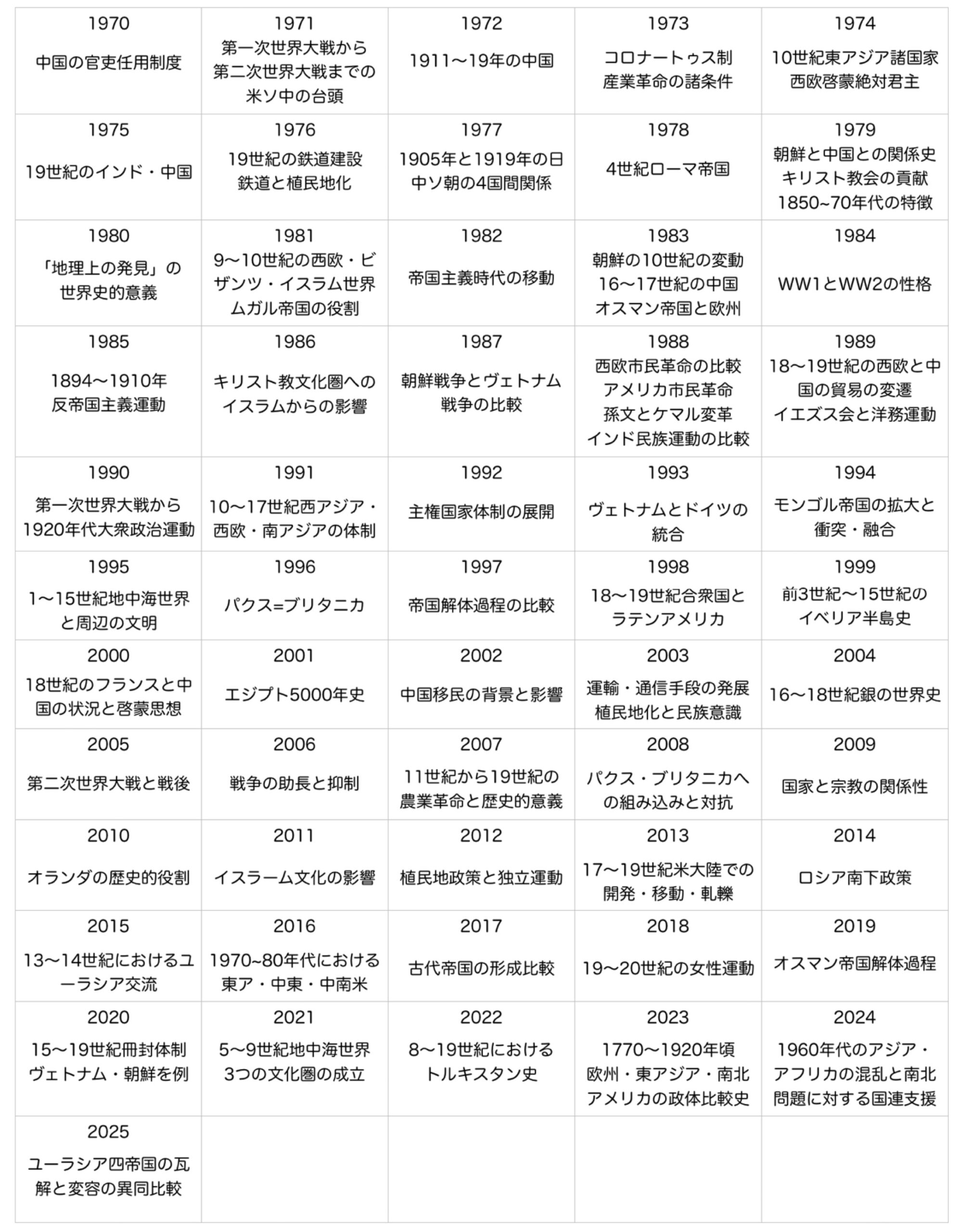 上記の一覧ではメイントピックを端的に知ることはできますが、細かな切り口や出題地域については分かりません。